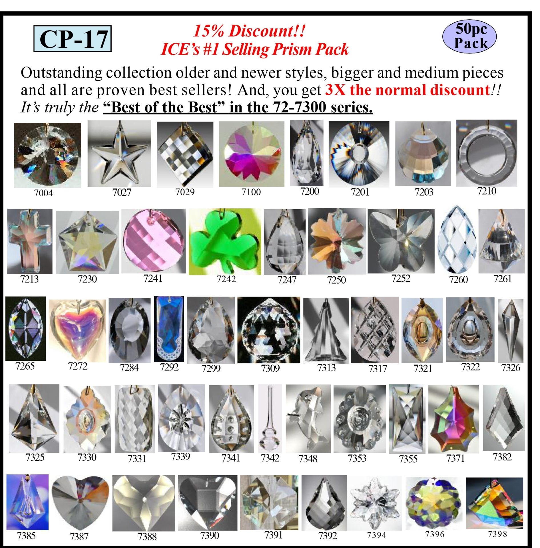 50 pc assortment of the top seling prisms from the 72/7300 series. Sizes range from 28-89mm. Assemble, ready to sell. Pack is discounted 15% from each piece reg selling price